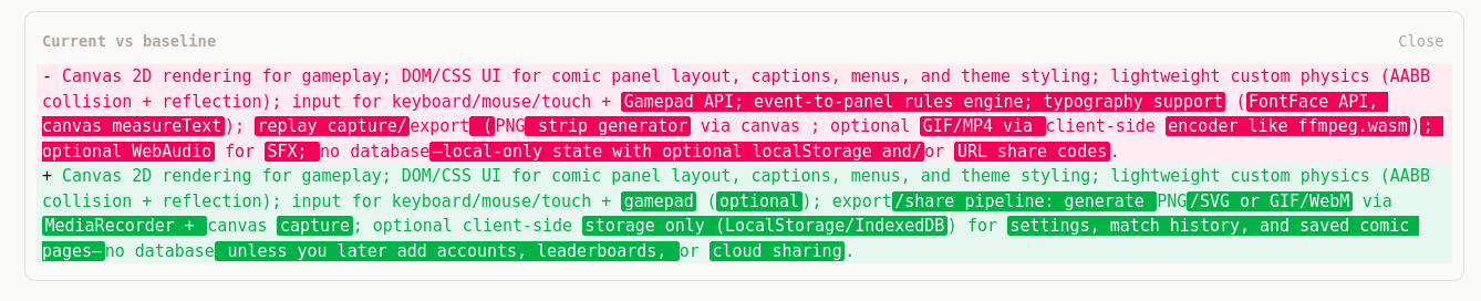 diffpackage. - Word-level highlighting (optional): on changed lines, highlight only the words that changed, not the whole line.